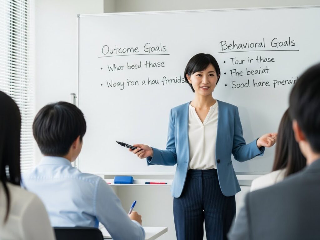 - 成果目標は進む方向、行動目標は歩幅。両方を組み合わせることで「ゴール」と「頑張り方」が結びつく