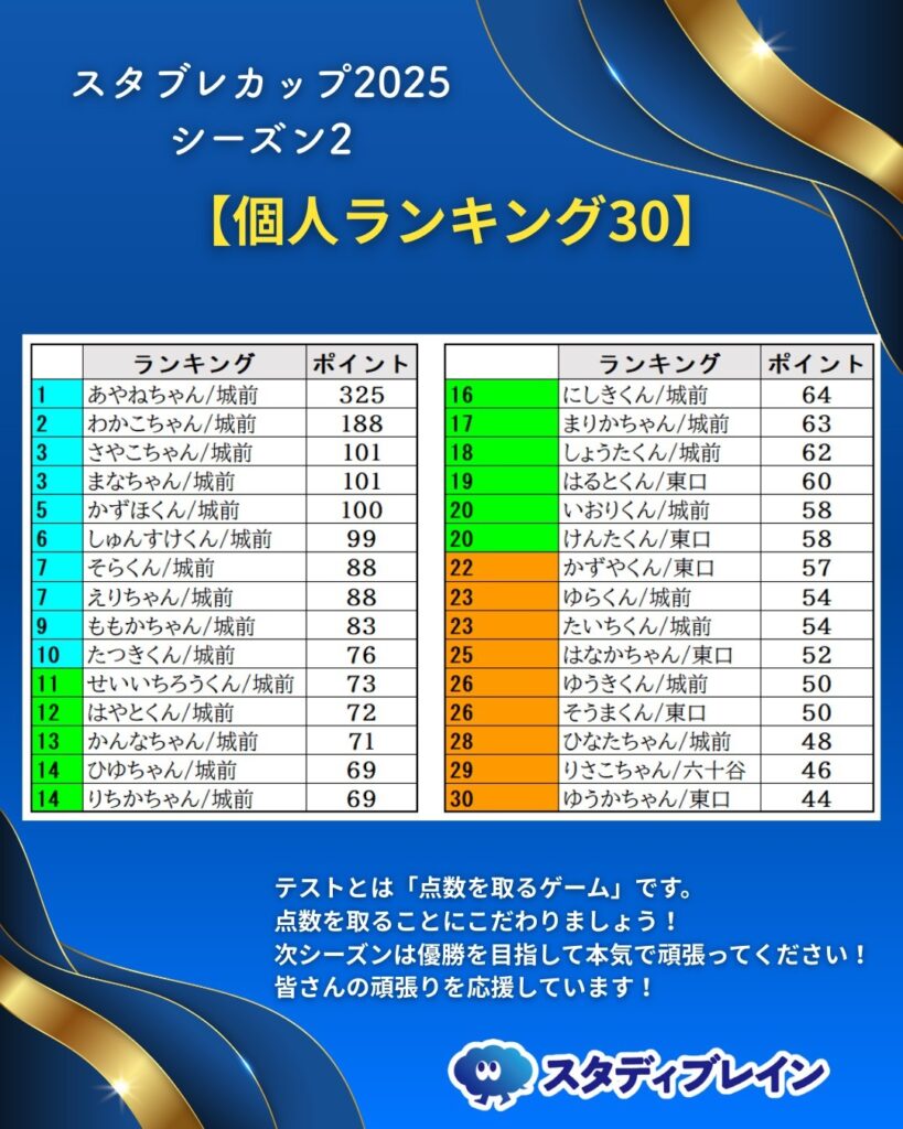 個人対抗部門上位30位:結果(スタブレカップ2025シーズン2)