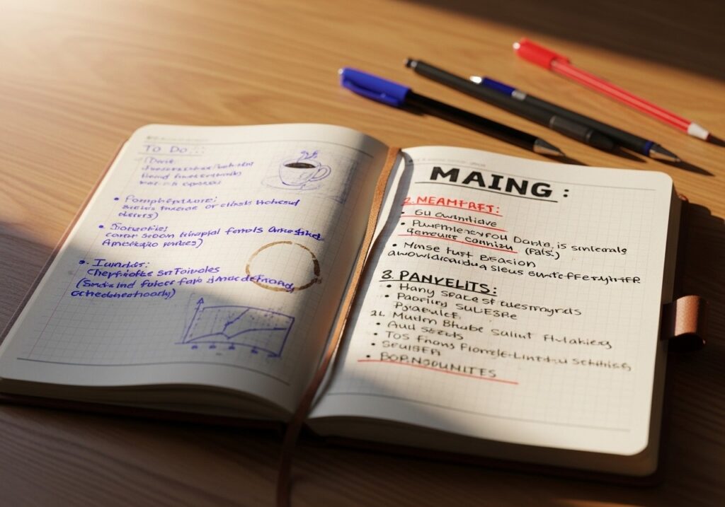 • 5分間ブラインド・スキャン: 寝る前に、今日書いたノートをざっと見返し、目を閉じて内容を頭の中で再生します。これだけで、翌朝の記憶の定着率は驚くほど変わります。