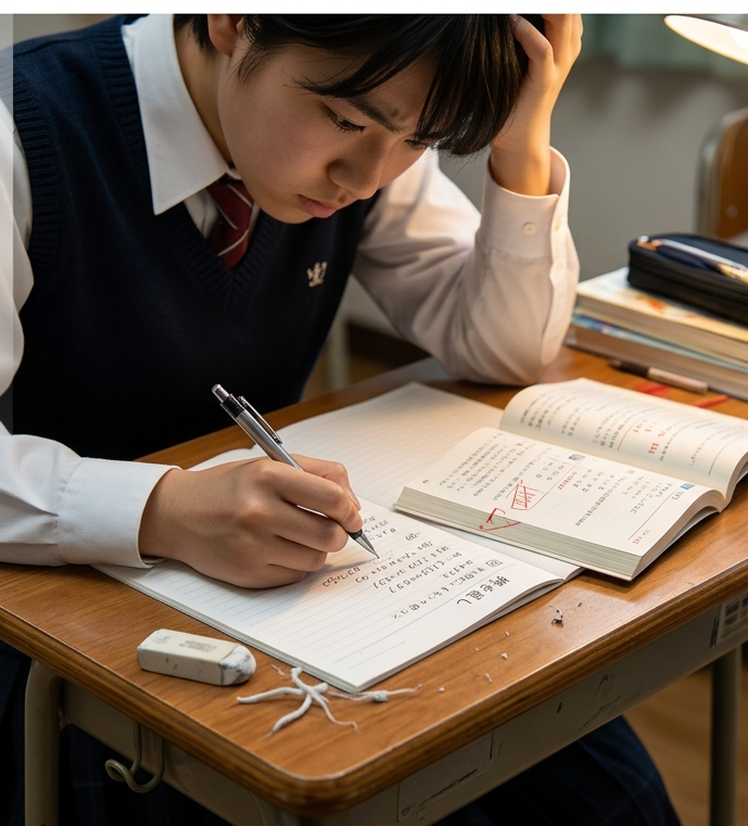 成績が急上昇する生徒の机には、ある日突然、大量のカスが出現します。 それは「分からない!」と割り切って答えを確認し、「よし、この解き方を完璧にコピーするぞ!」と猛然と手を動かし始めた合図です。 答えを写し、隠して解き直し、間違えたら潔く消してまた再現する。この「高速回転」の摩擦熱こそが、大量のカスの正体です。