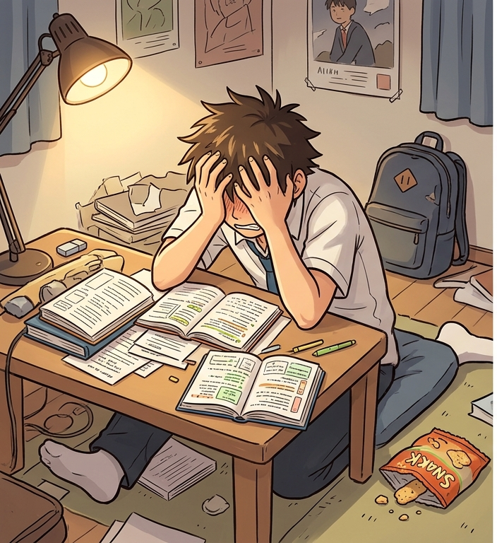 テスト範囲が広大すぎると、脳がパニックを起こし、昨日までの努力を一時的に忘却(あるいはノーカウントに)します。「数学の図形は完璧だけど、関数がまだだ……。よし、全体として『全然やってない』ことにしよう」という極端な思考停止。